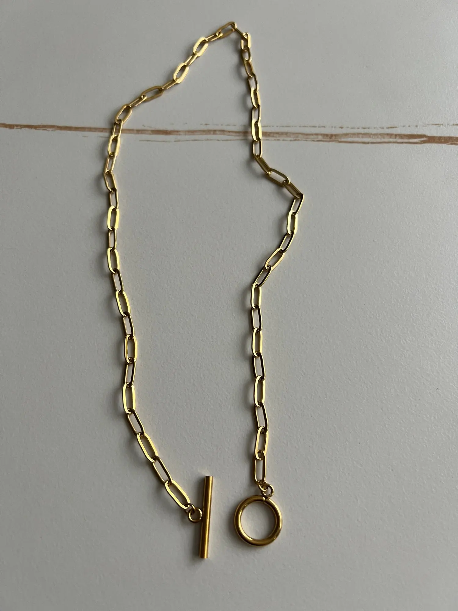 Nola dessine une ligne nette autour du cou, comme une évidence. Sa chaîne aux maillons allongés capte la lumière avec subtilité, pendant que le fermoir toggle devient un détail central, presque bijou dans le bijou. Porté sur une chemise ouverte ou à même la peau, il structure la silhouette sans en faire trop. Une pièce minimaliste qui impose doucement son style.
